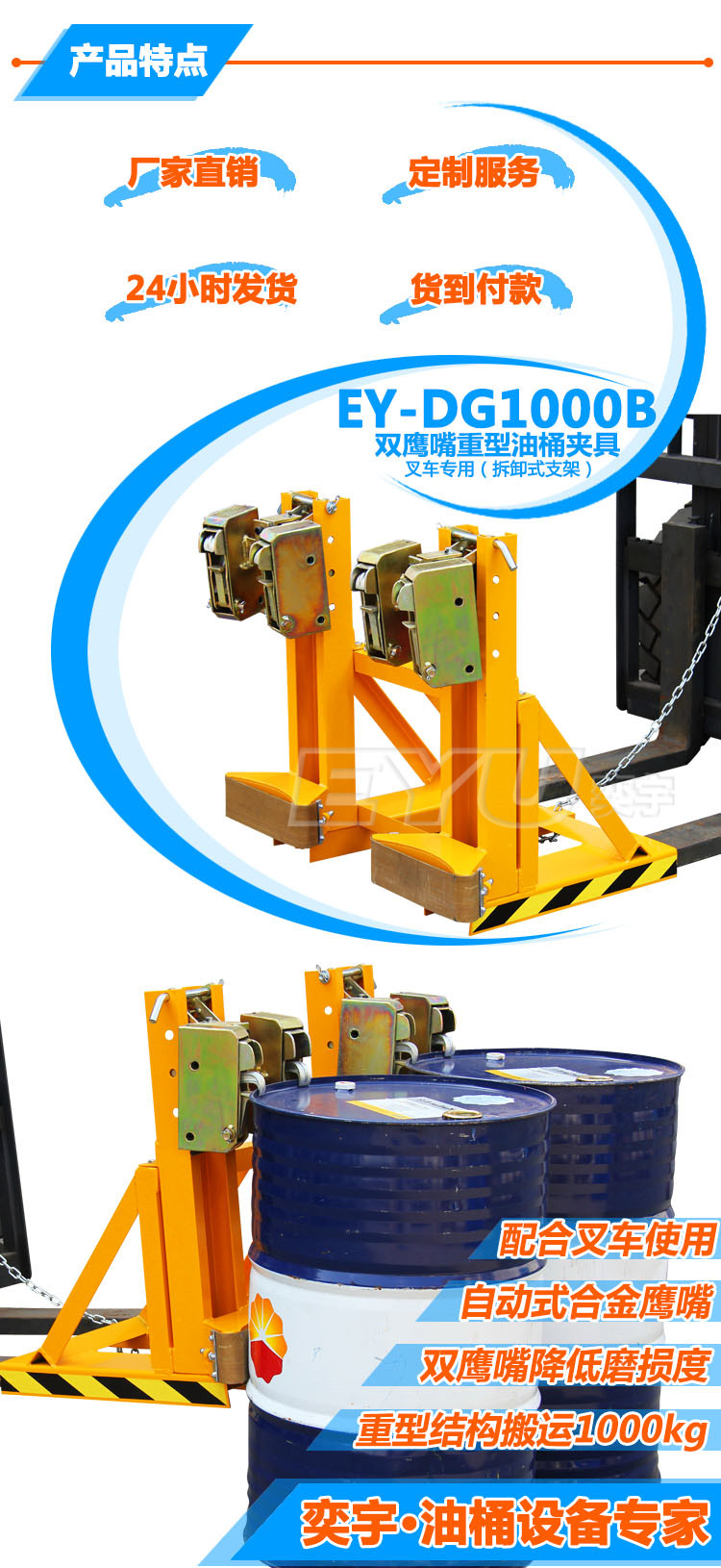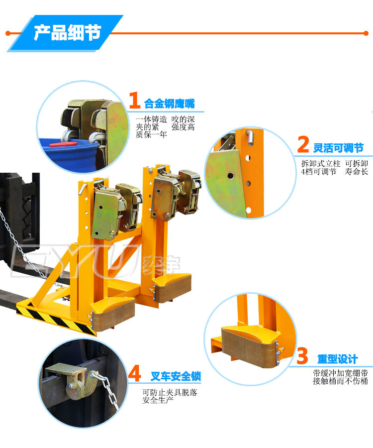6.油桶夾的核心部件“夾頭”采用特殊低合金結(jié)構(gòu)鋼制作,堅(jiān)固耐用。
