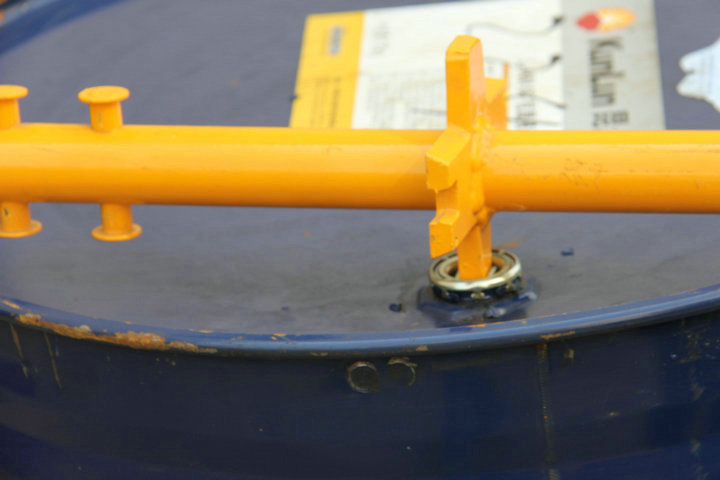 ★*步:拿掉‘手拉把手’,利用上面的結(jié)構(gòu),可以用作杠桿,輕易翹起油桶一邊。 然后,推入底下的‘三輪小車’,即可移動油桶。 |