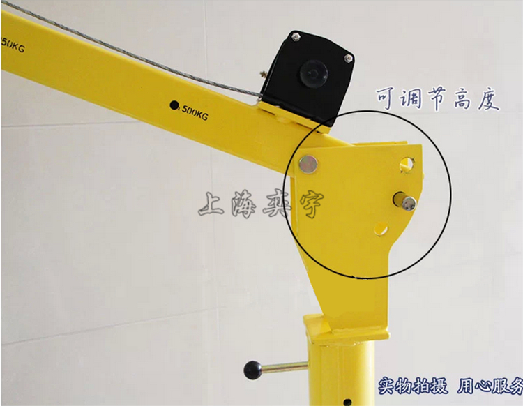 3.吊臂長(zhǎng)度:吊鉤下落地面與主桿距離0.9-1.5米可調(diào),3孔定位銷眼可調(diào)節(jié)。