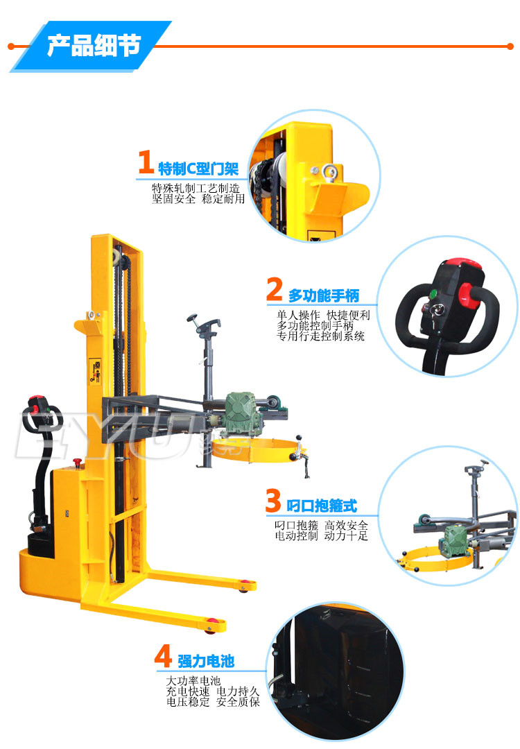 1.適用于55加侖鋼制油桶的搬運(yùn)、提升、裝卸作業(yè),該車采用進(jìn)口電動(dòng)車專用行走控制系統(tǒng),行走穩(wěn)定,具有輕便、靈活的特性,可單人操作。