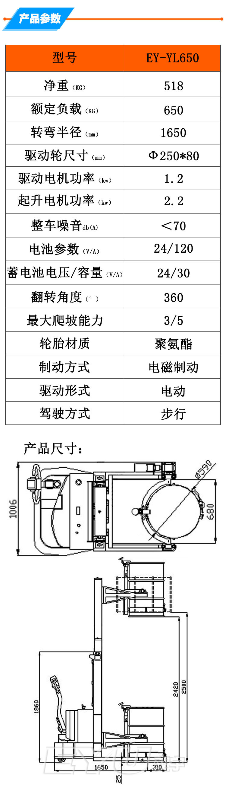 EY-YL650全電動(dòng)油桶車詳細(xì)參數(shù):