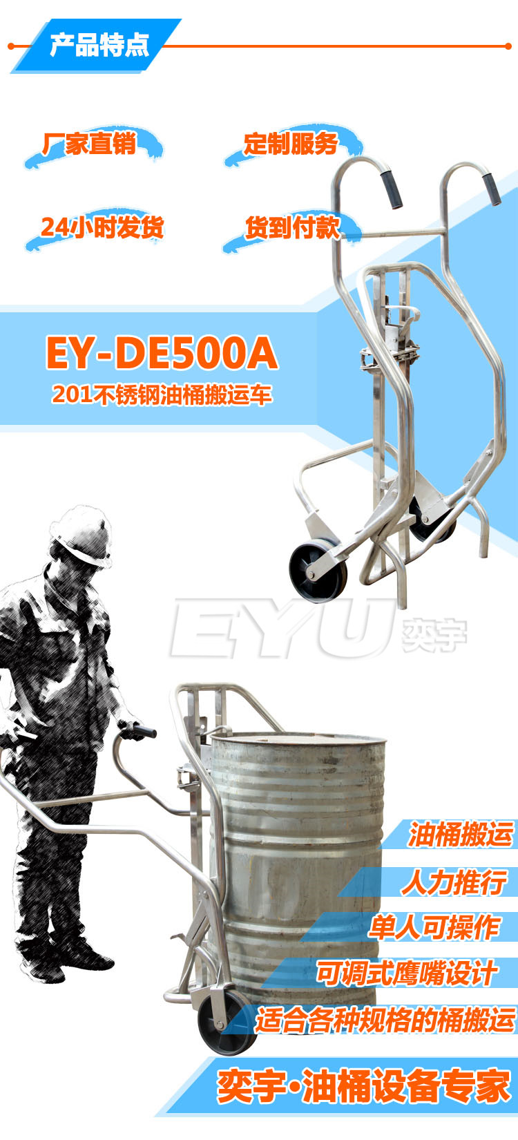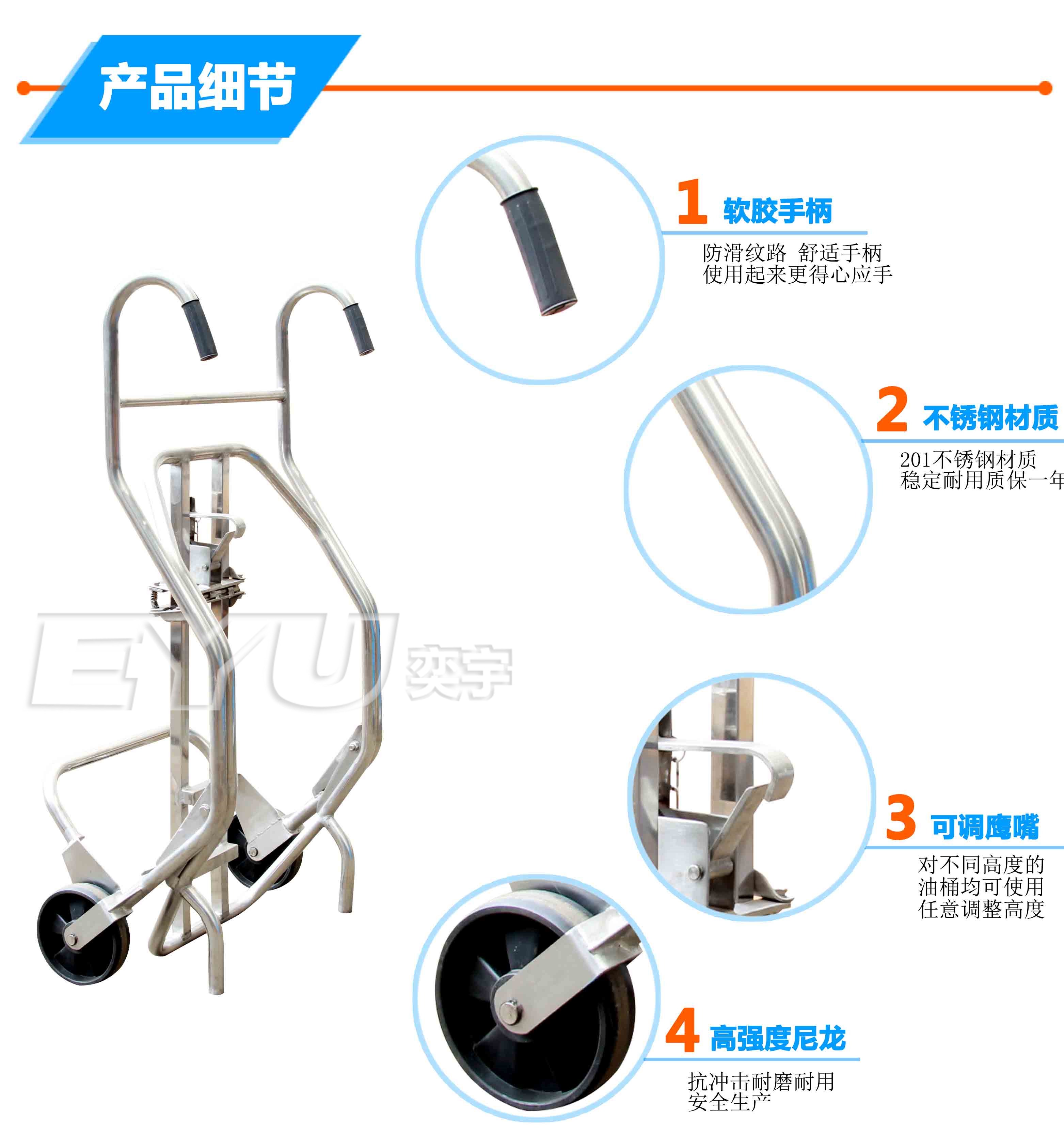 201不銹鋼油桶車的主要用途:EY-DE500A整車不銹鋼材質(zhì),結(jié)構(gòu)巧妙?烧{(diào)式鷹嘴,適合各種規(guī)格的桶搬運(yùn)。