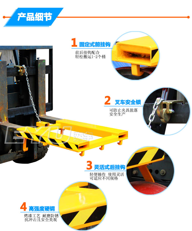 純機(jī)械結(jié)構(gòu)設(shè)計,僅依靠叉車的動作,一次可以搬運(yùn),堆碼,裝卸1-2個水平方向的桶。
