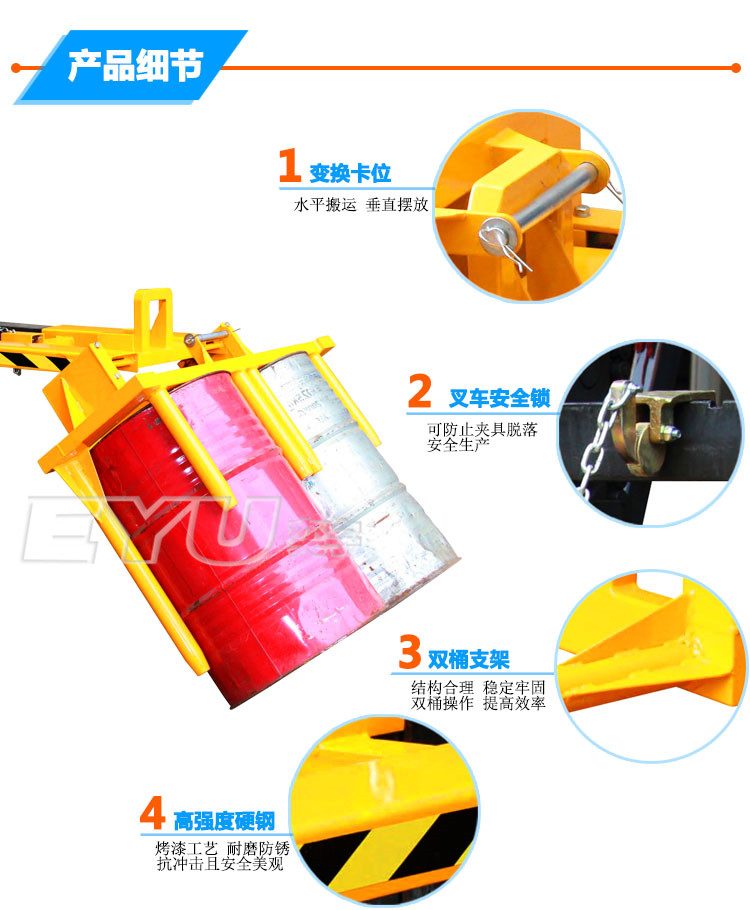 雙油桶翻轉(zhuǎn)夾的主要用途:EY-DR800A雙油桶翻轉(zhuǎn)夾最大的用途就是可將油桶水平狀態(tài)轉(zhuǎn)換成直立狀態(tài),廣泛應(yīng)用于化工,食品,醫(yī)藥等行業(yè)對水平放置的油桶進(jìn)行搬運(yùn),堆高裝卸作業(yè)。