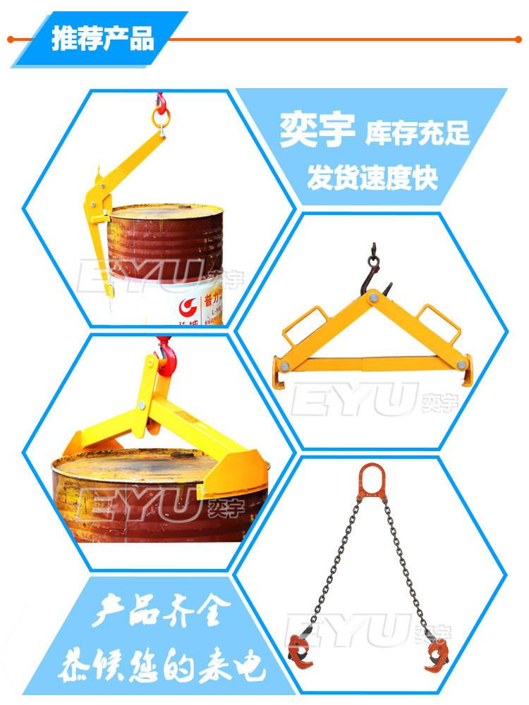 2.適用于配合行車或叉車貨叉吊進(jìn)行吊運(yùn)標(biāo)準(zhǔn)鋼制油桶或帶固定圈的塑料桶