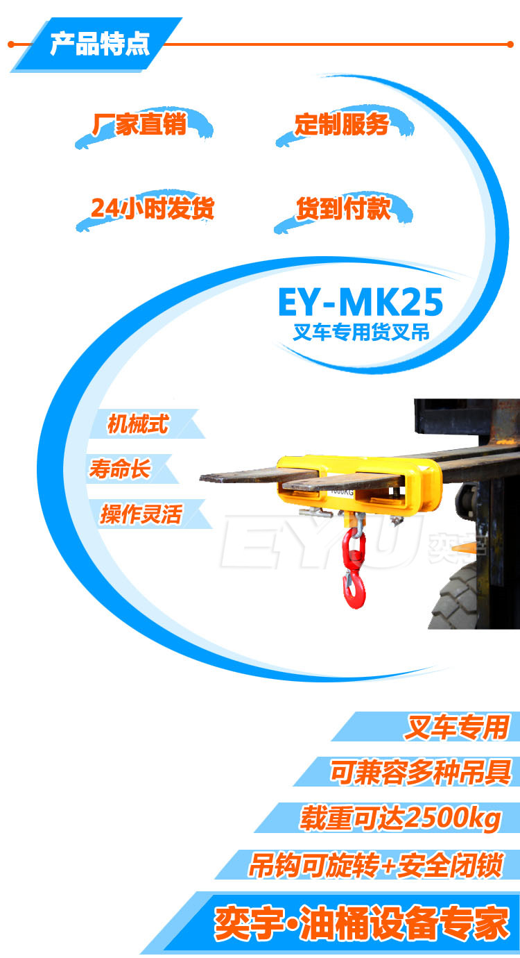 1.使叉車成為一臺移動吊機,吊鉤可旋轉(zhuǎn)并帶有安全閉鎖