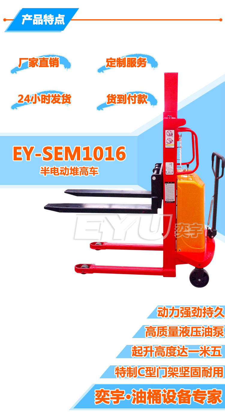 半電動(dòng)堆高車的主要用途:EY-SEM系列半電動(dòng)堆高車由上海奕宇電子科技有限公司廠家直營,我廠銷售的半電動(dòng)堆高車采用高質(zhì)量的油缸,起升速度快,起升高度能達(dá)到3500mm,半電動(dòng)堆高車配有可調(diào)式鋼板蓋式貨叉,雙剎車系統(tǒng),配有智能充電機(jī),堅(jiān)固耐用。